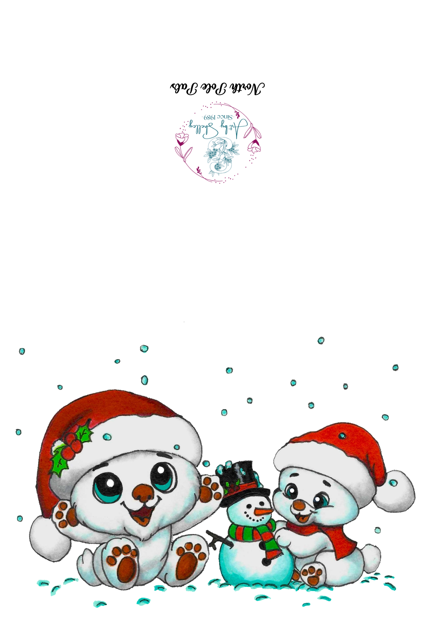 Bring a touch of charm and seasonal joy to your greetings with this whimsical greeting card, featuring two cute polar bears enjoying a snowy day. One polar bear is playfully building a snowman while the other frolics in the winter wonderland, making this card a perfect way to brighten someone’s day. Whether it’s for a birthday, holiday, or special occasion, this delightful depiction of playful polar bears is designed to warm hearts and inspire smiles.