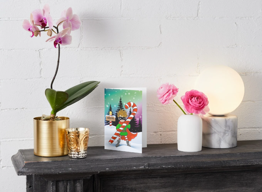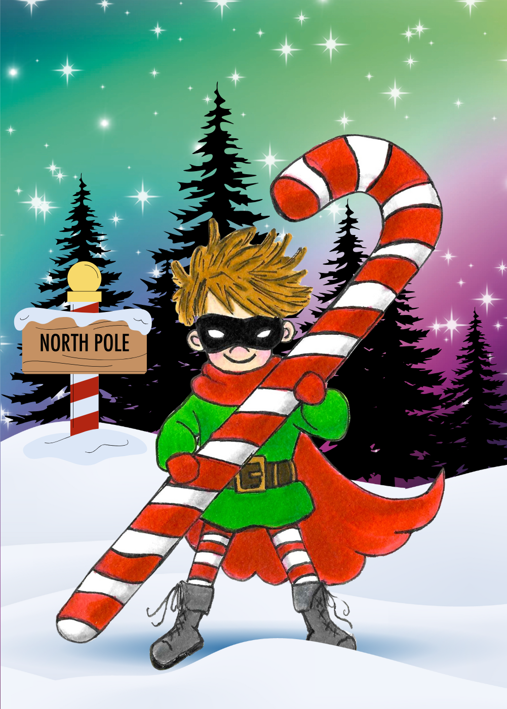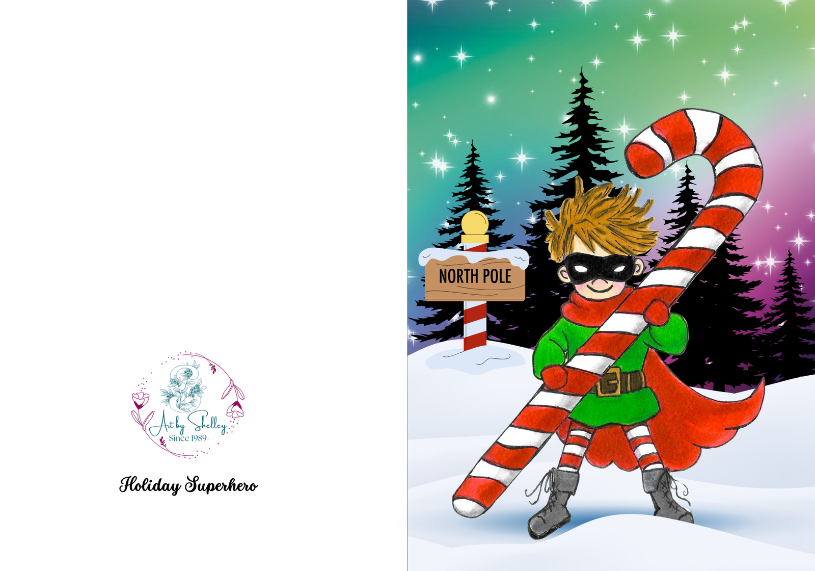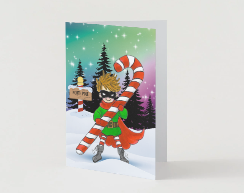 This greeting card displays vibrant colors, playful imagery, and a unique holiday story. The young boy superhero, clad in iconic superhero gear, stands courageously against the snowy backdrop of the North Pole, safeguarding holiday traditions with his giant candy cane weapon. This card is perfect for anyone who loves quirky, visually captivating designs that stand out from traditional greetings.