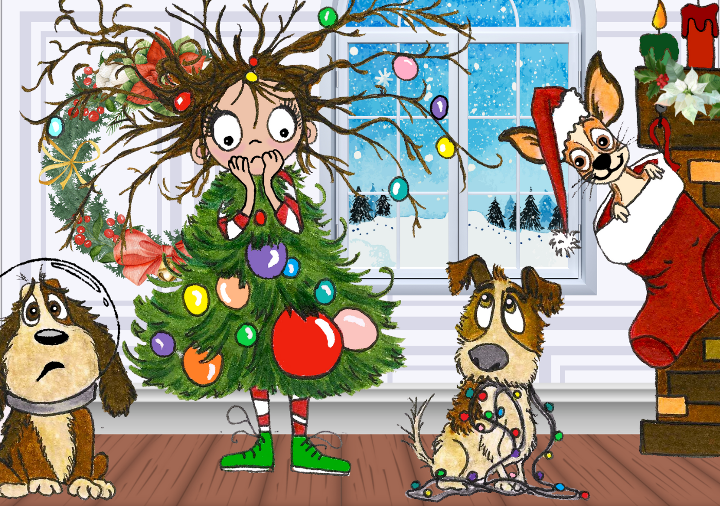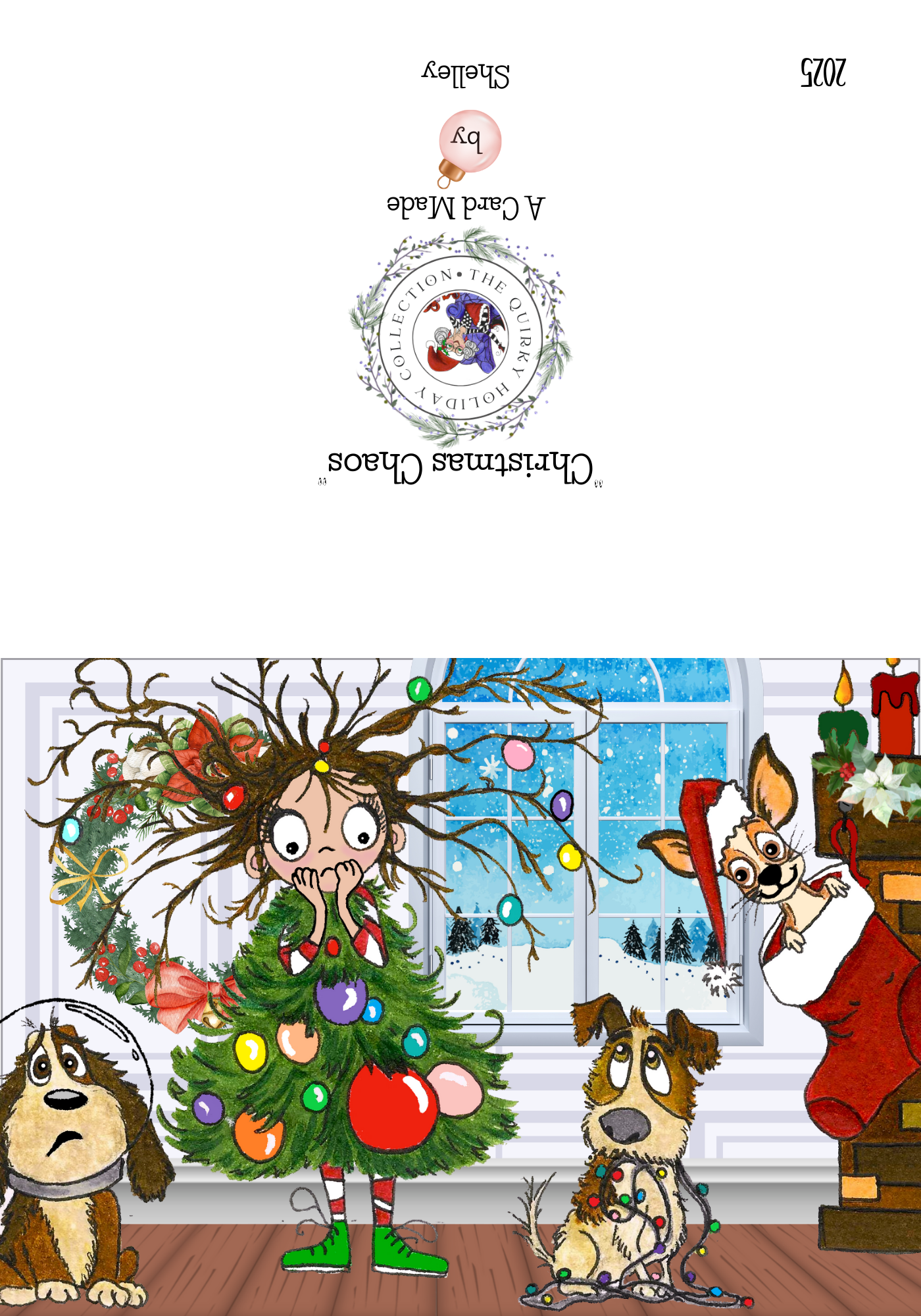 Bring laughter and joy into your holiday celebrations with this playful greeting card! Featuring a quirky design of a young girl hilariously stuck in a Christmas tree, while her mischievous dogs add to the chaos—one even wearing a fishbowl on its head—this card encapsulates the warmth, humor, and love that make the holiday season so special. Whether you’re sending this to friends, family, or colleagues, it’s sure to be a conversation starter and bring smiles all around.