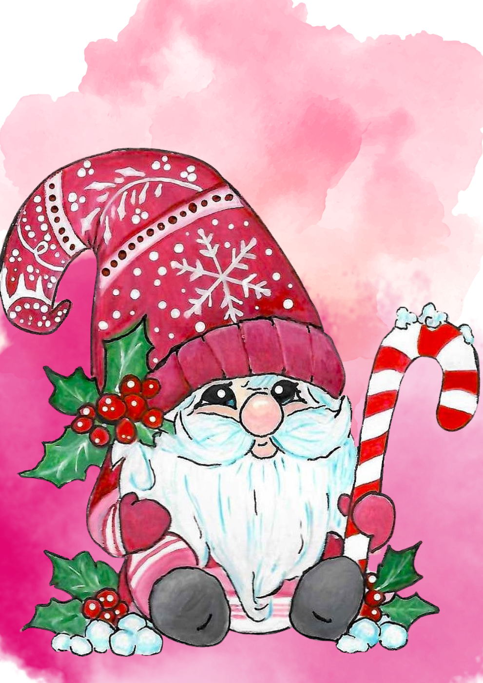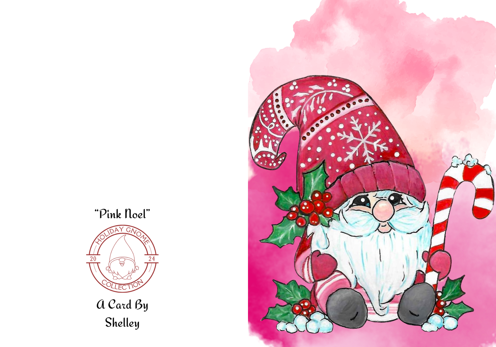 Add a touch of whimsy and elegance to your holiday greetings with this enchanting greeting card featuring Pink Noel, the Pink Christmas gnome. Dressed in adorable shades of pink and holding a cheerful candy cane and adorned with holly, this watercolor-painted design is perfect for spreading festive cheer to family and friends. Whether you’re sending warm wishes or looking to brighten someone’s day, this card embodies the joyful spirit of the holidays.
