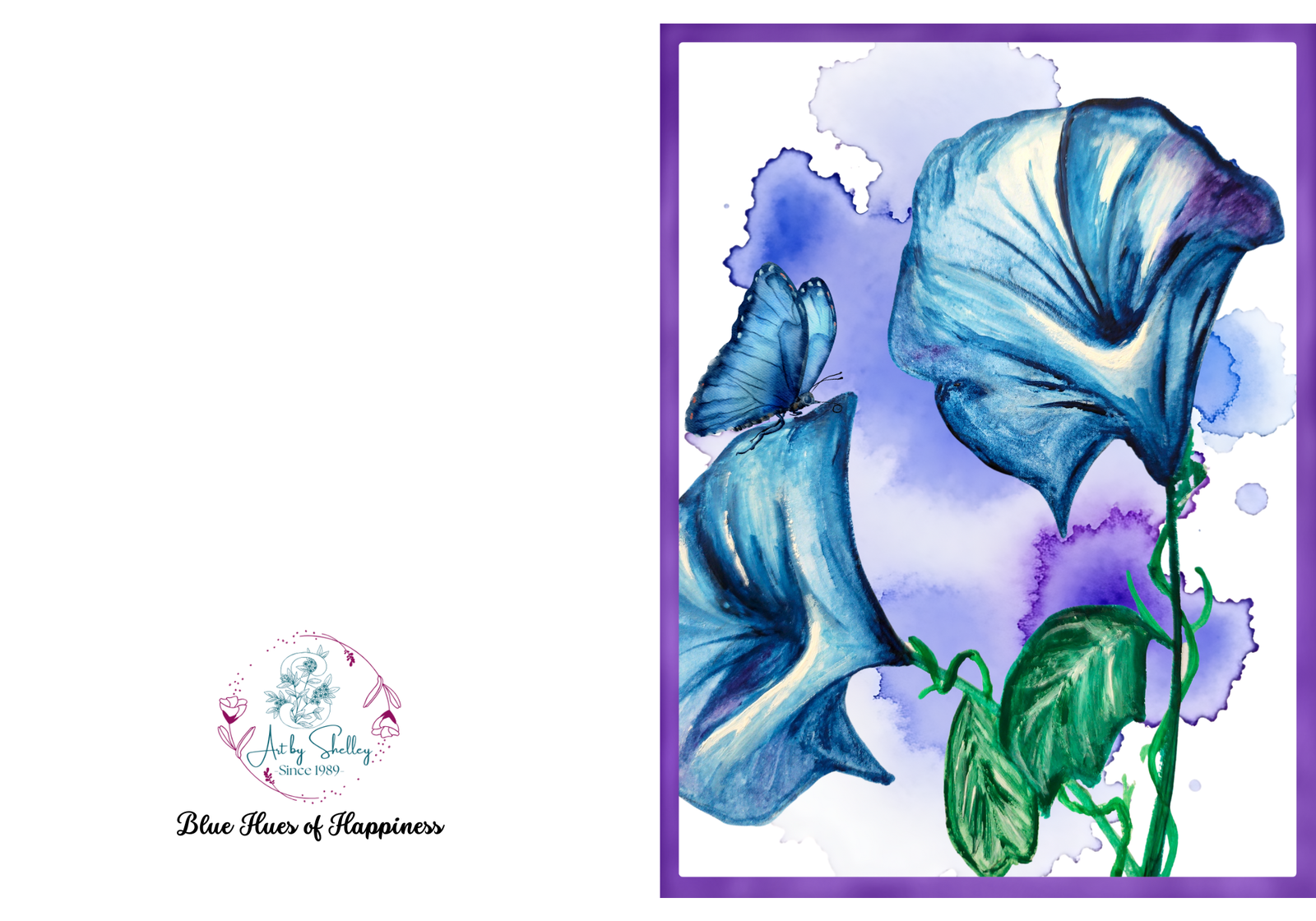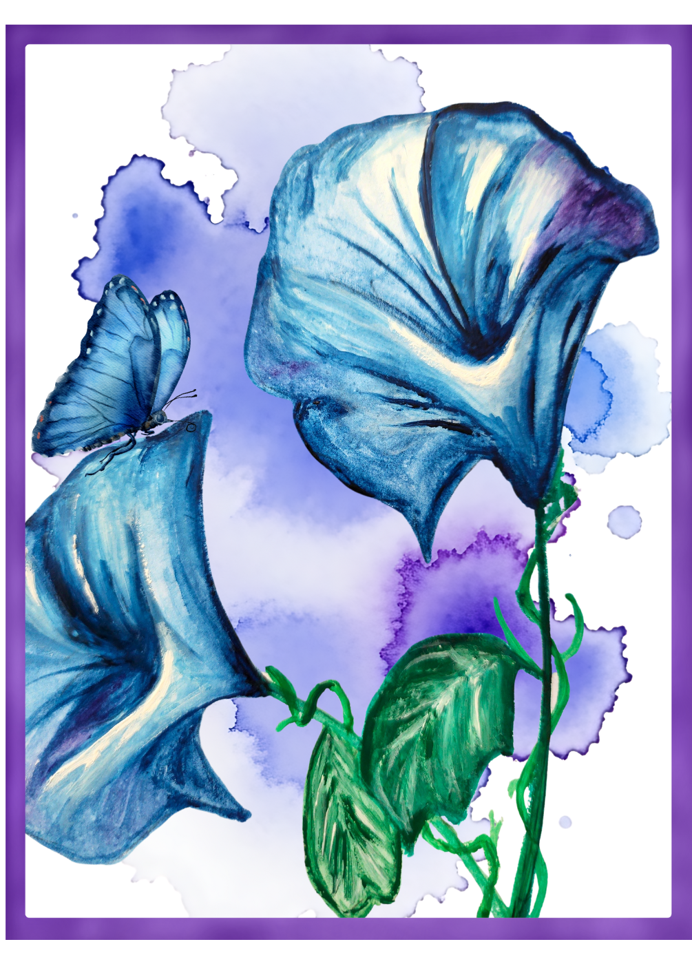 Capture the essence of nature with our exquisite greeting card featuring the delicate beauty of blue Morning Glory flowers. Painted in stunning watercolor, the artwork is complemented by an enchanting blend of purple and blue hues in the background and a blue butterfly. This thoughtfully designed card is the perfect way to convey your heartfelt sentiments for any special occasion.