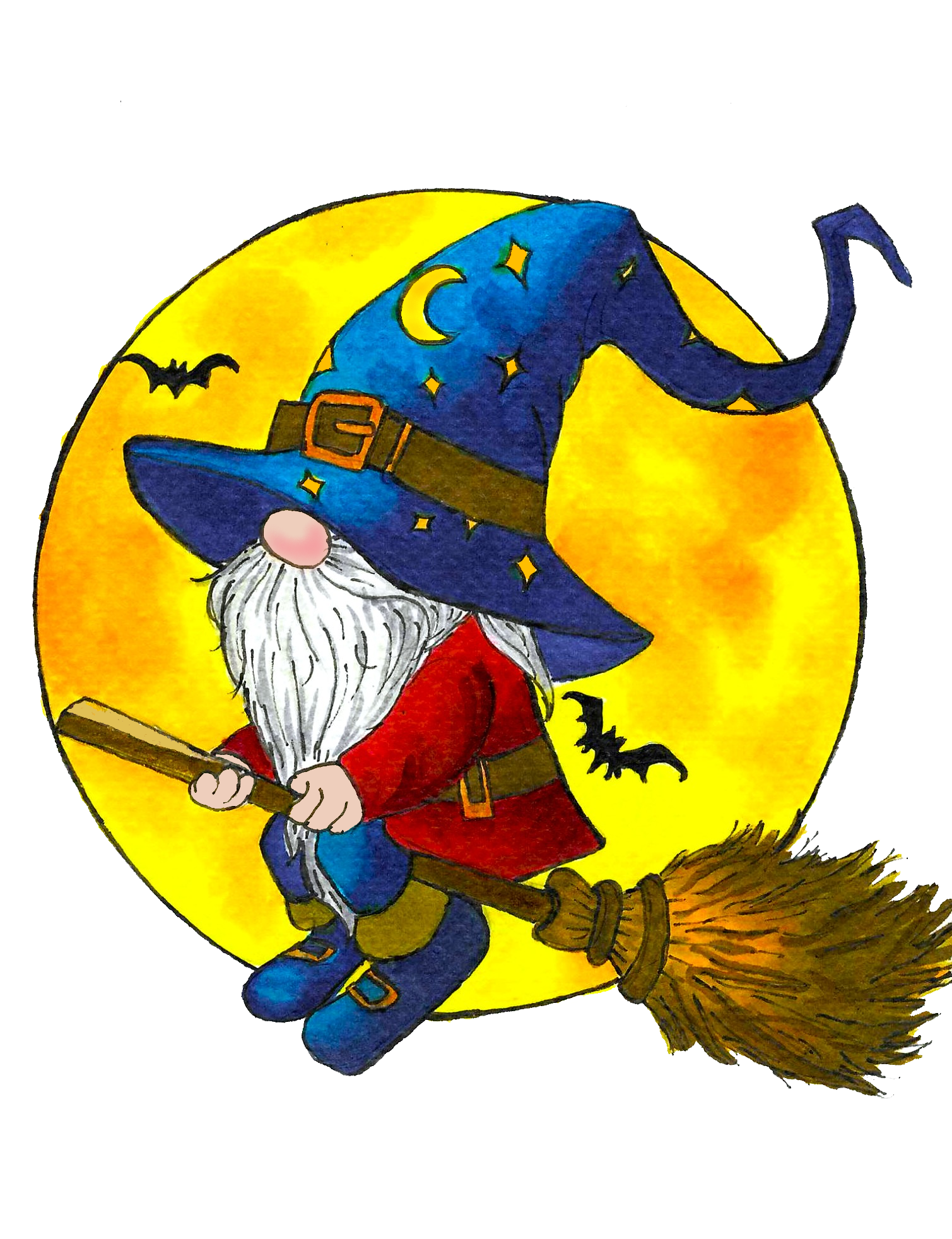 Welcome the Halloween season with this beautifully designed greeting card, featuring a charming gnome dressed as a witch, flying on a broom against a mesmerizing moonlit night. This card is perfect for adding a touch of whimsical magic to your Halloween greetings, whether shared with friends, family, or colleagues. The intricate design captures the playful essence of Halloween while showcasing the unique character of the gnome.