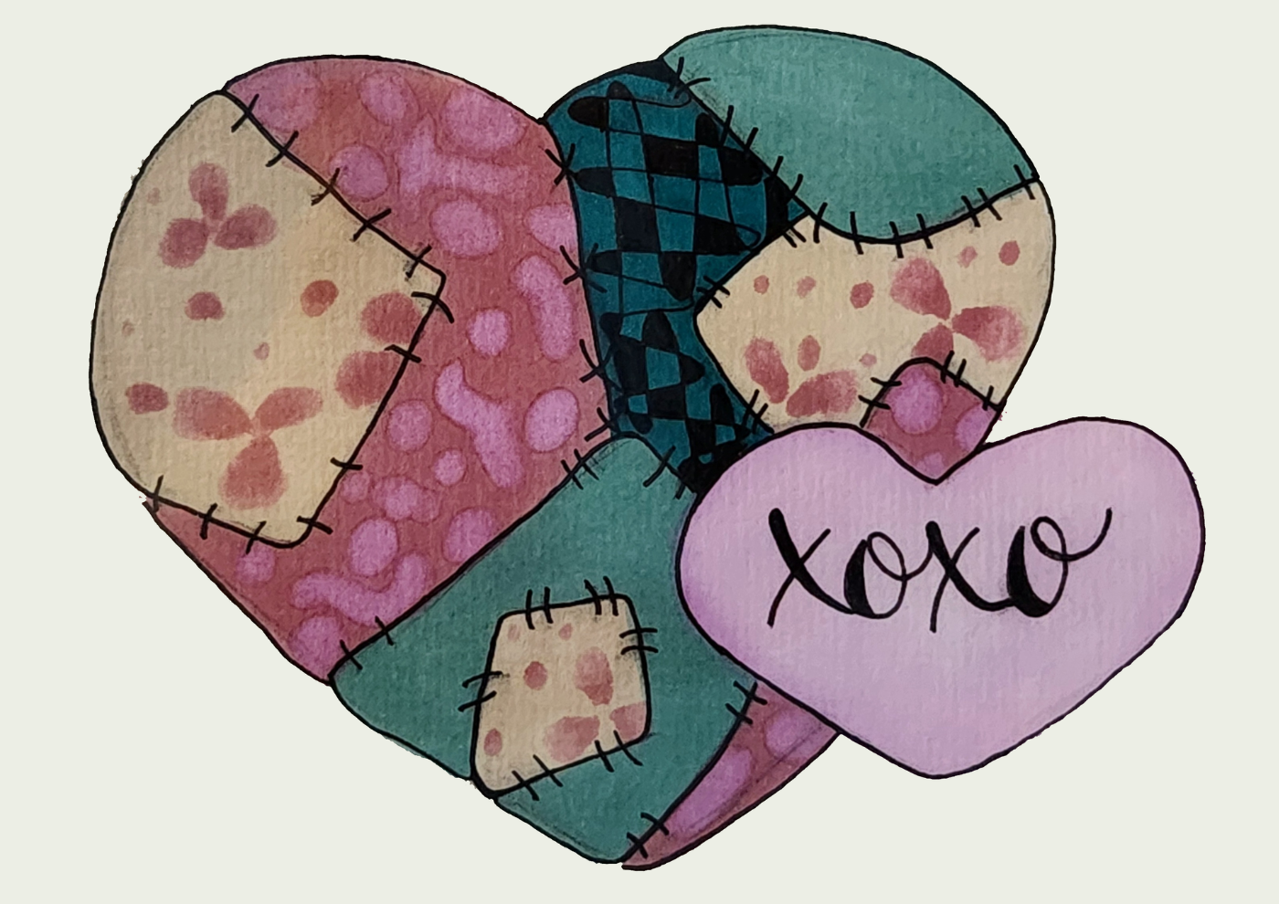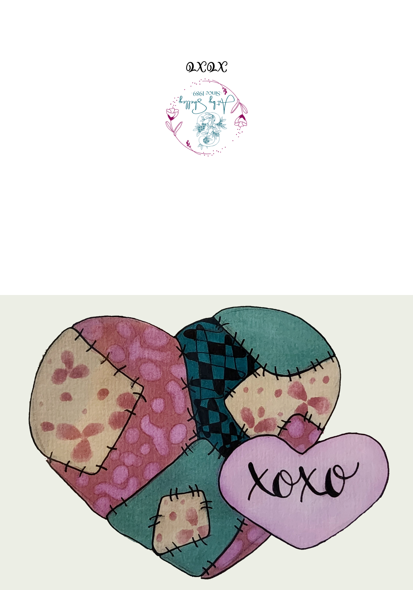Make every greeting special with this beautifully handcrafted patchwork heart greeting card. Designed to evoke warmth and sentiment, this card features a heart design composed of carefully arranged patchwork patterns in soothing pastel colors of pink, teal, and tan. To top it off, the letters “XOXO” are delicately embedded, adding a touch of affection perfect for any heartfelt occasion.