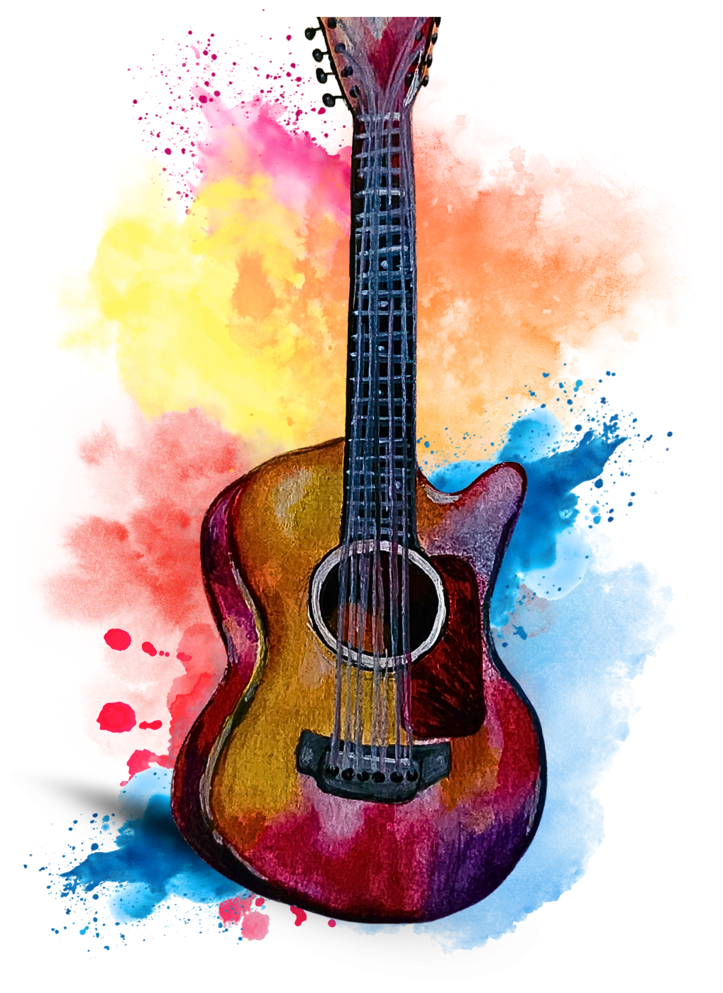 This watercolor greeting card boasts a bold and vibrant palette, with mesmerizing shades of red, orange, yellow, pink, and blue flowing seamlessly together to create a striking backdrop. The elegant depiction of a guitar in the foreground further enhances the artistic appeal, making this card not only a communication tool but a small piece of art. Ideal for displaying or framing, this greeting card is sure to bring joy to its recipient every time they glance at it.