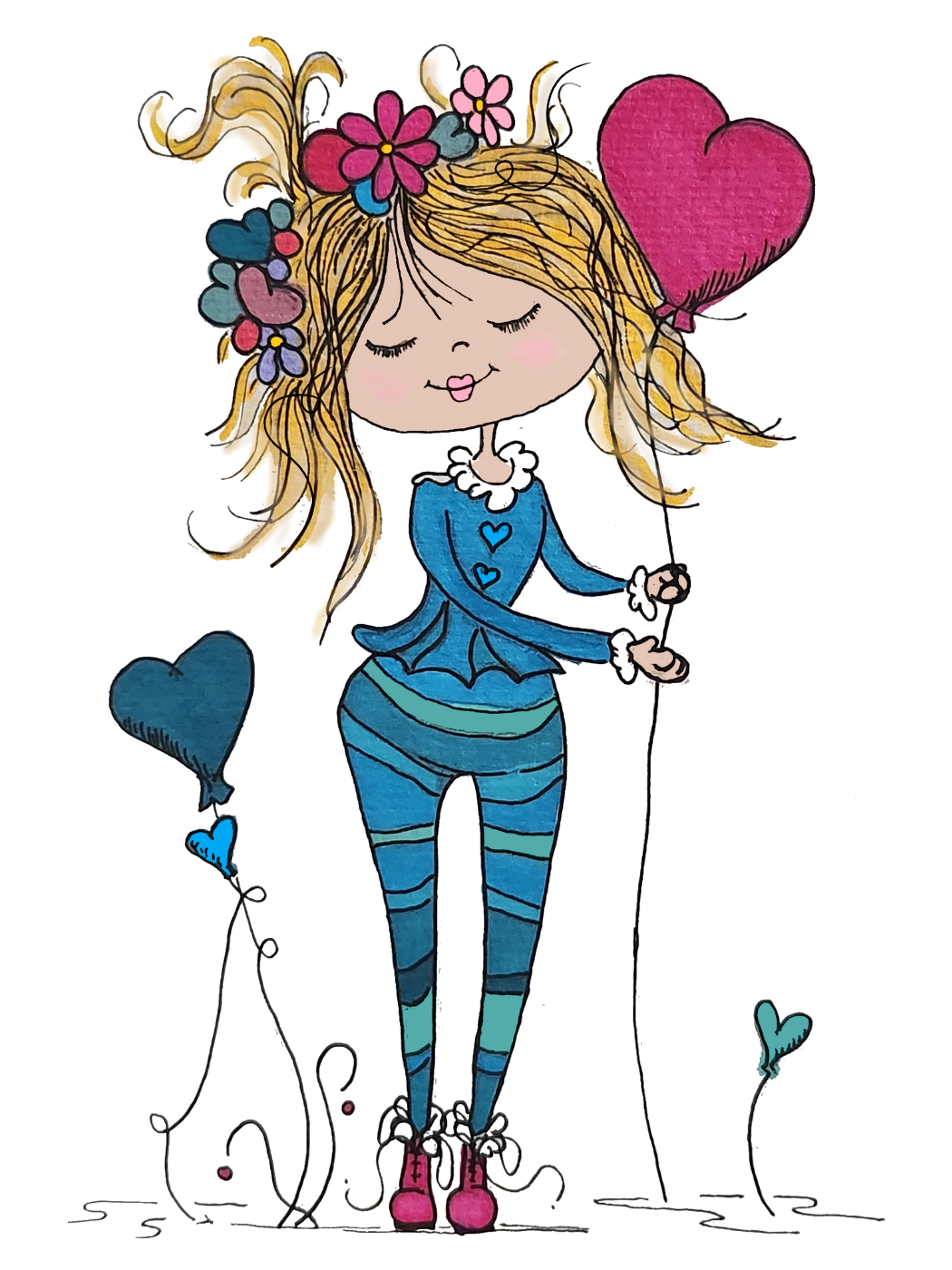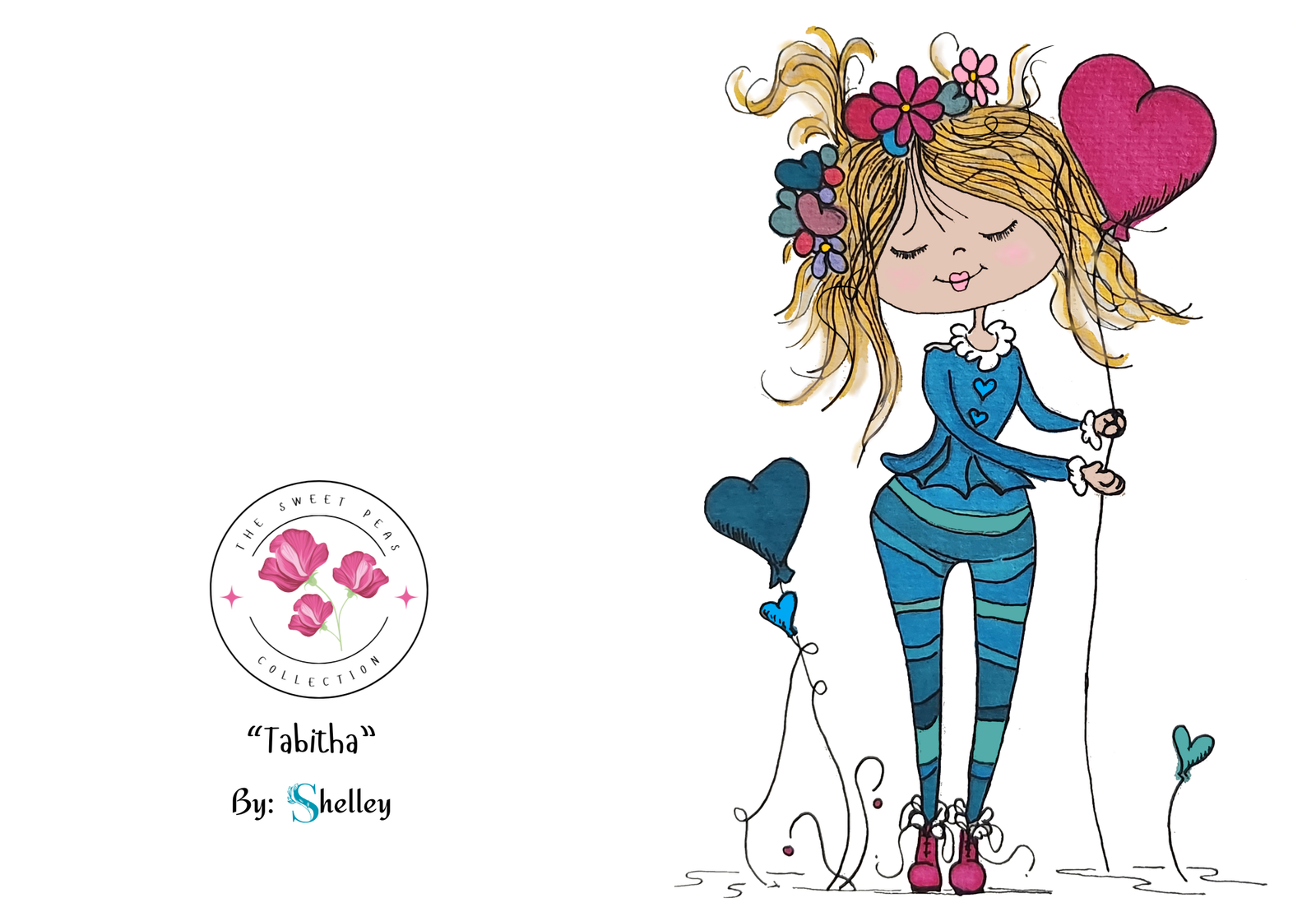 This delightful greeting card showcases Tabitha, a playful character from the Sweet Pea Collection, dressed in a charming all-blue ensemble. Her quirky blonde hair adds a touch of whimsy, while the balloon she holds and the flowers in her hair create an irresistible combination of fun and cuteness. Designed to make hearts smile, this card is perfect for spreading cheer across any celebration or heartfelt moment.