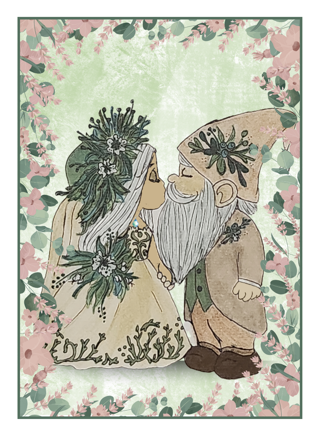 Celebrate life’s most cherished moments with a greeting card that combines a touch of whimsy and timeless beauty. This gorgeous card features an enchanting depiction of a gnome bride and groom, carefully designed in neutral earth tones to evoke feelings of warmth and sophistication. From its intricate details to the beautifully crafted floral border in muted hues of pinks, greens and browns, this card is designed to bring joy to your recipients.