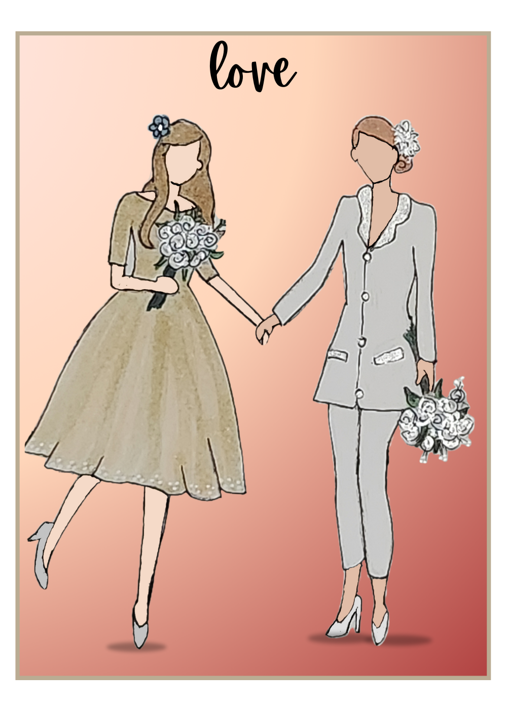 This card offers a charming design where two women are holding hands, radiating joy and mutual affection. Created with care, the artwork is both modern and meaningful, incorporating delicate details that are sure to resonate with the couple on their special day. The imagery promotes inclusivity and represents the beauty of diverse relationships while remaining tasteful and heartwarming.